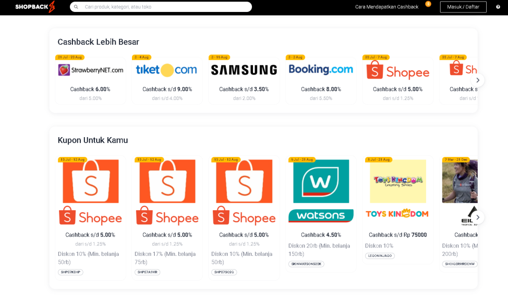 Shopback menawarkan diskon dan penawaran cashback melalui tampilan landing page yang menarik.