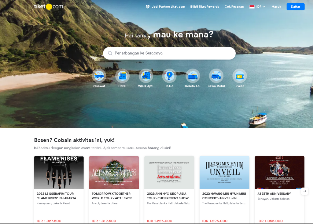 Dengan antarmuka yang sederhana namun menarik, Tiket.com menawarkan informasi tentang berbagai acara dan penawaran tiket.